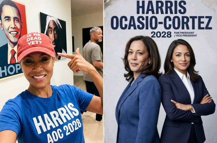 Jada shared a selfie that shows her wearing a Harris/AOC 2028 t-shirt while pointing to a red ball cap she wore with white lettering that reads: “Is He Dead Yet?” It isn’t clear who she’s referring to. [More]